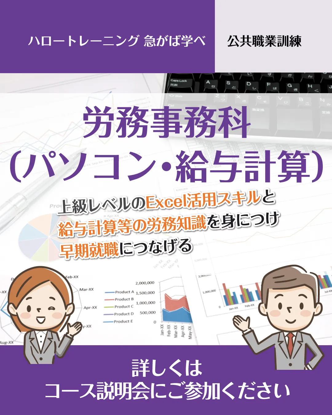 | 対象者 | パソコンの使用経験があり、一般事務をはじめとする労務事務への就労を希望する方 |